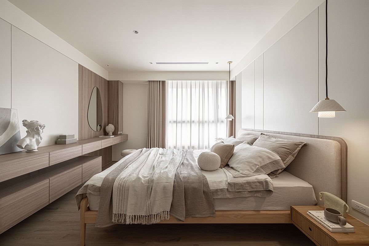卧室的设计便不会像公区那般大刀阔斧,将木色要素延续至床头,半包裹式的床头背景便是主卧室里的***硬装设计。