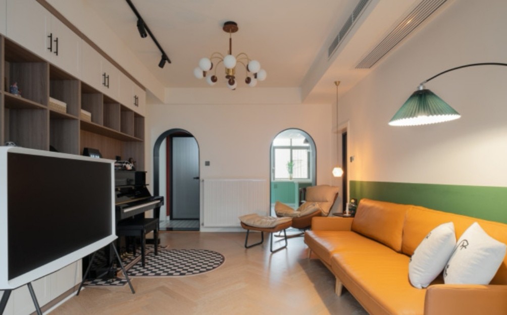 客厅去中心化设计增加空间功能,摒弃传统电视墙,定制开放式书柜,放置物品方便又美观。书柜留足空间打造钢琴区,让兴趣爱好成为生活的艺术品。