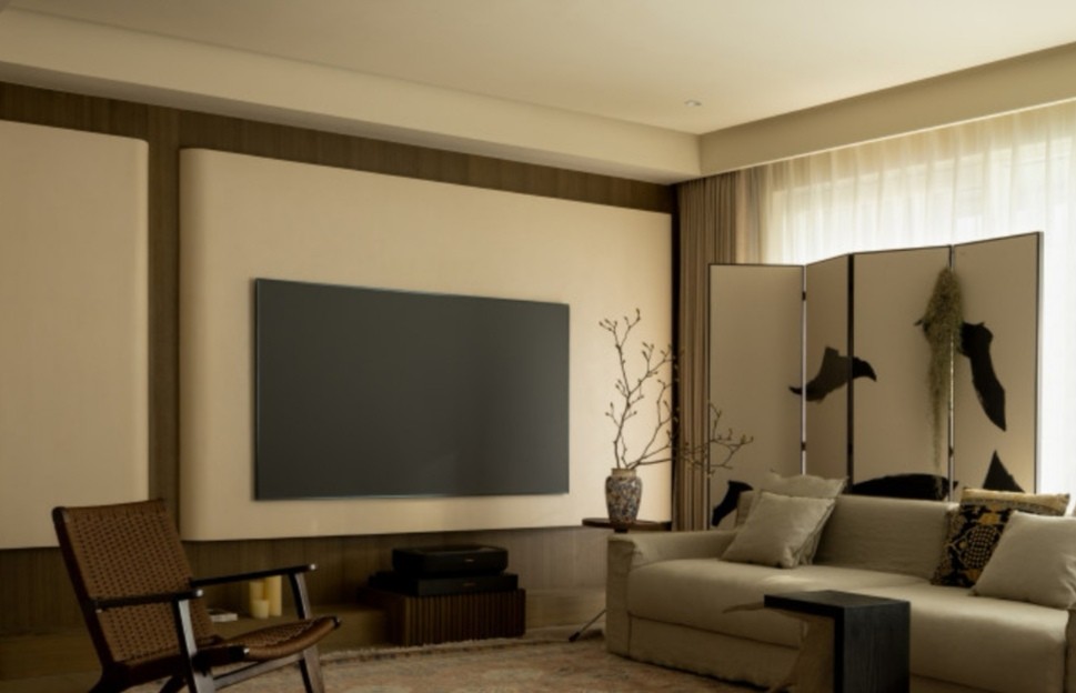 立于沙发后的飞鸟墨影折叠屏风,汲中式美学与隔断设计精髓为一体,填补客厅过分留白,引人遐想,犹入古代山水画境。