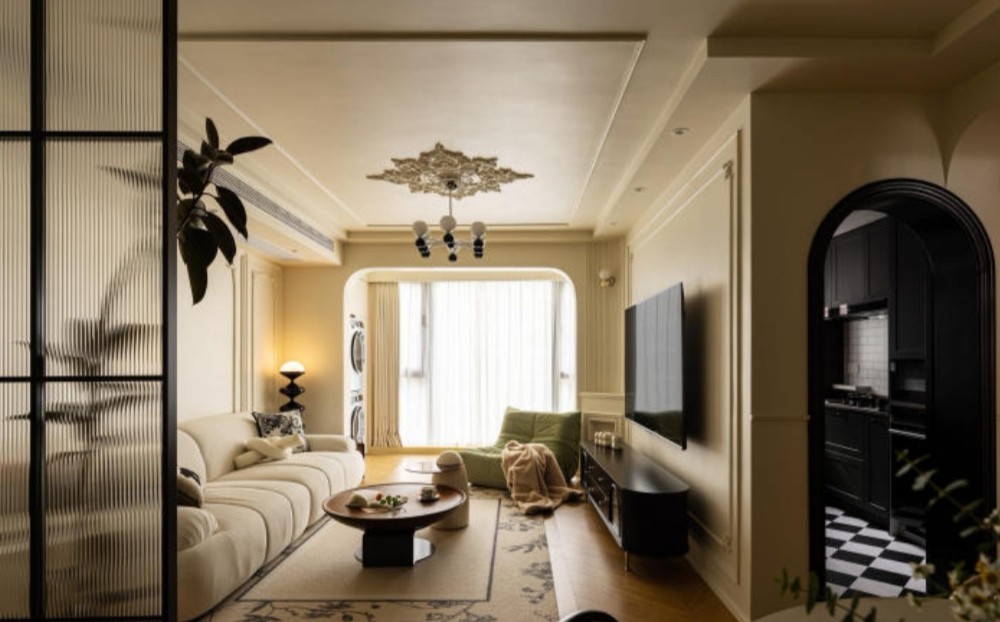 从厨房看向餐厅,门洞做拱形造型处理,搭配复古黑色门套,质感神秘优雅,内侧靠墙定制上轨道移门,门体收起时厨房呈现开放布局,与走廊及餐厅之间没有遮挡,关上后即形成封闭空间,避免油烟外泄,同时大面积格子玻璃能保证采光不受影响,下厨空间保留通透视野。