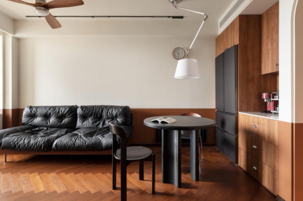此案在格局上,保留了三个卧室空间,在入户区,拆除了原先的柜子,新建墙体,形成了一个单独的玄关区域,同时在餐厅区域,设计了餐边柜西厨操作空间,冰箱也进行了收纳。风格上,我们进行大变样,重现在瓷砖上面铺了木地板,墙面进行了重现粉刷,颜色色调上面,采用了暗红色和胡桃色,黑色结合,让整个空间更有小复古的感觉。