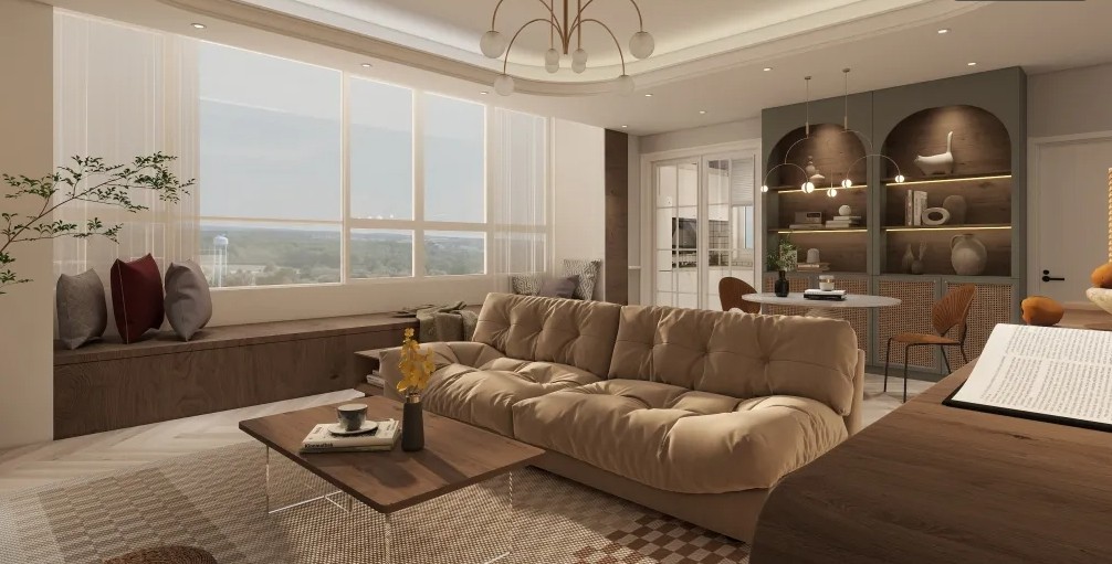 暖白色与木饰面结合带来温馨感,浅色家具增强空间的明亮感,避免沉闷。阳台打通,做阳台柜设立收纳区,良好的采光,筑造不一样的家居氛围。
