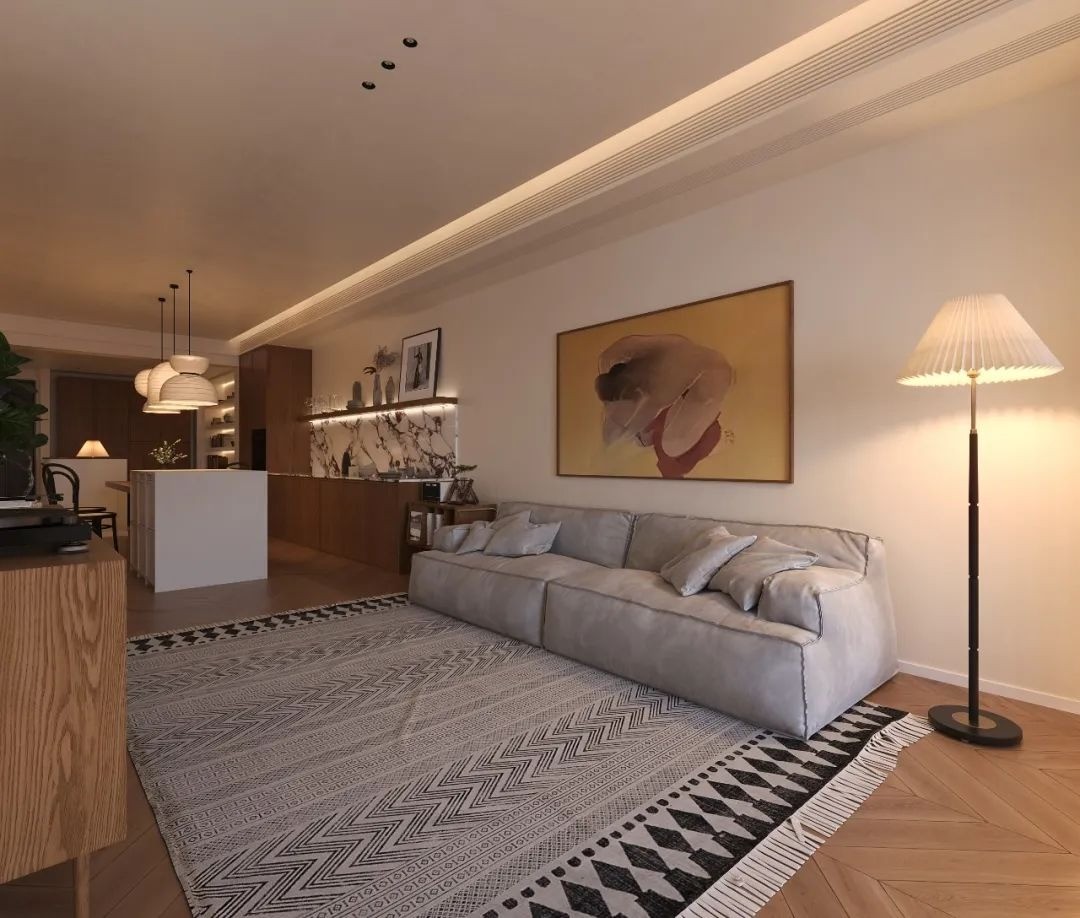 用原木色作为底色,沉淀质感、清爽温润,鱼骨拼地板通铺,清新复古,开放式的空间布局,让竖厅也能变的宽敞明亮~