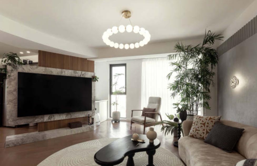 水磨石壁灯光线柔和而温暖,为空间提供了一份宁静和浪漫。整个客厅空间在灰色调、绿植和水磨石壁灯的映衬下,呈现出一种静谧而和谐的美感。这里既是一个可以放松身心的休憩之所,也是一个可以让人静心思考、感受生活美好的地方。