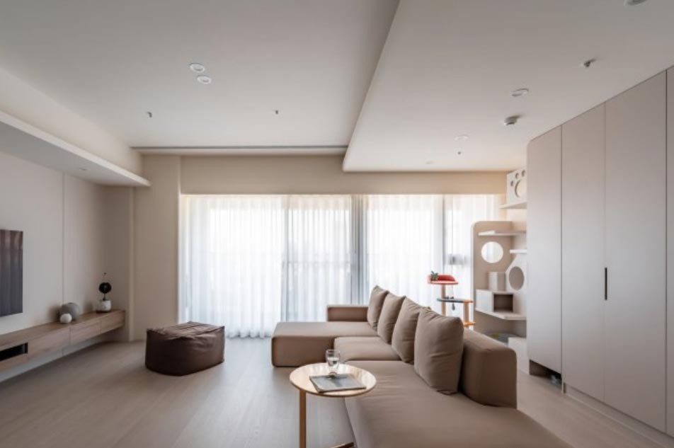 客厅的主色调选择了白色系,拆改一间卧室后,客厅实现了大衡厅的布局,超大的落地窗将窗外的美景映入室内。