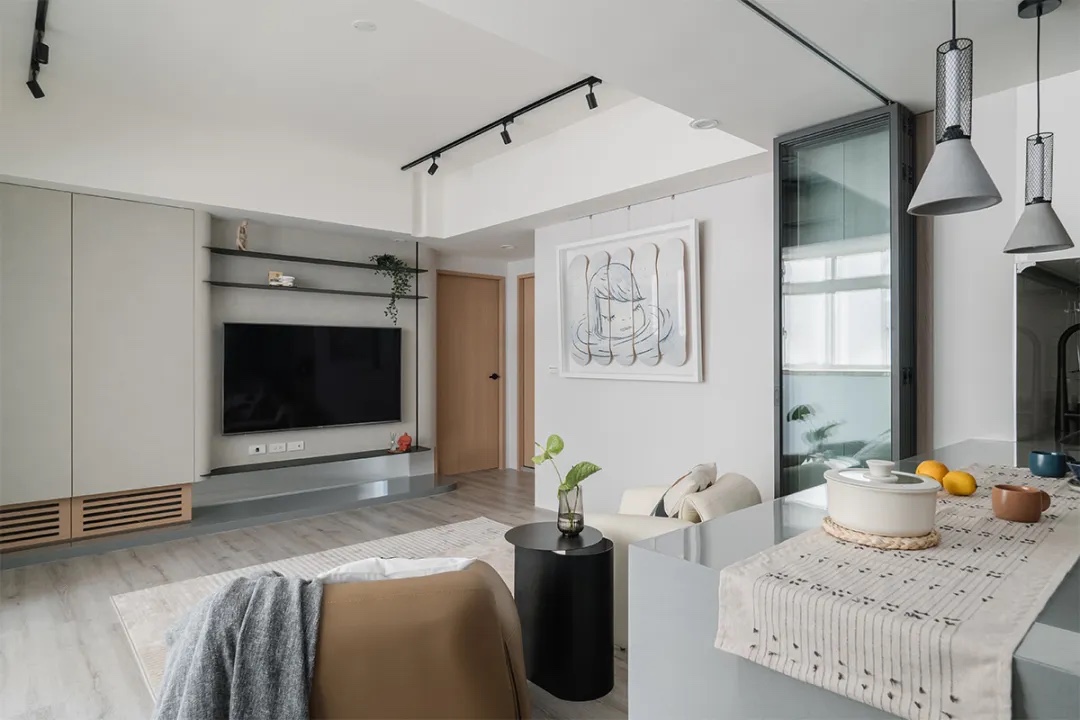 由一字形厨区拉出一条中岛轴线 与座落于中心点的沙发形成高低落差层次感 坐在可容纳至少5人的中岛,视线可望向电视墙 援引玻璃折门形成灵动、不受拘束的自由框界 料理时亦能阻绝逸散油烟