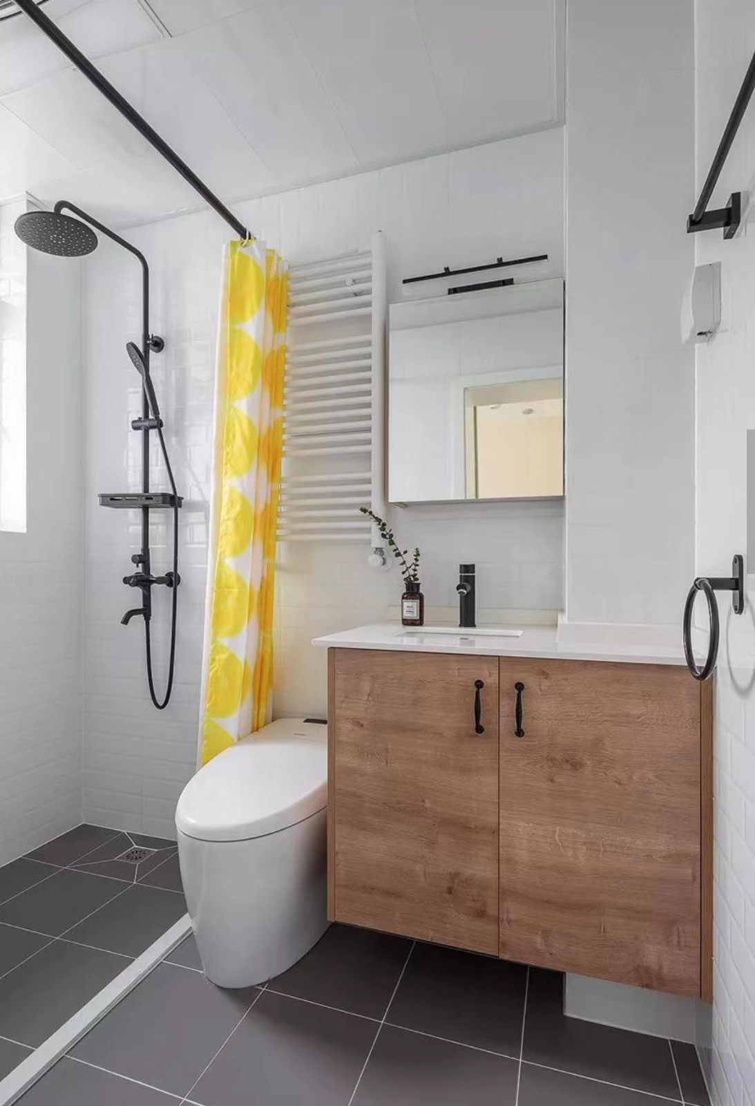 卫生间延续用小白条砖,原木色活宝柜,搭配黑色 五金件,即视感十足