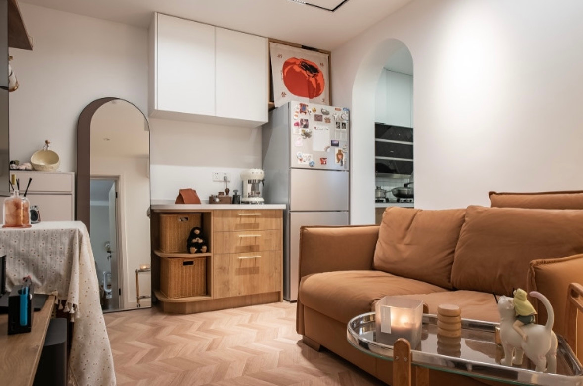 因为平时做饭不多,客厅通向厨房没有做门,而是挖出一个拱形门洞,造型正好和穿衣镜呼应上,看起来很有氛围感。