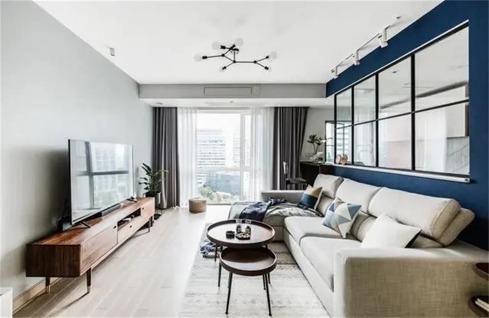 客厅拥有不小的落地窗,视野和采光都不错。为了更好的发挥客厅优势,将客厅与厨房隔墙拆除一半做玻璃隔断,让空间更通透宽敞。色调选择上以浅色为主,让空间更显轻盈、朴素。
