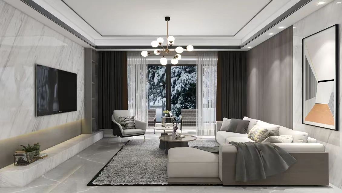 客厅,大面积暖色调的运用,无主灯设计,暗藏线性氛围光源,视觉上增加层高,装饰织物上点缀明快的黄色调,将活力引入空间。