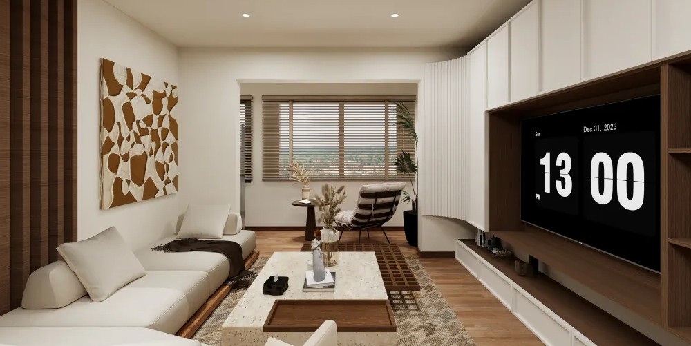 客厅电视背景墙定制一整排柜子,足够的收纳力是生活的底气;与阳台打通,百叶帘与纱帘搭配,可调节室内光影,也让空间显大加倍。