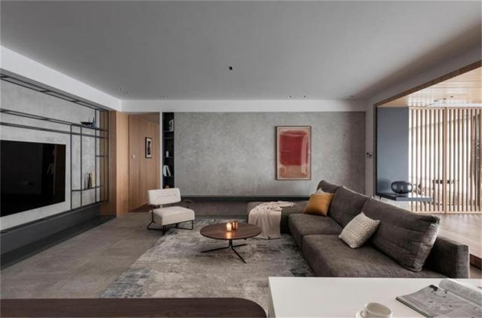 客厅侧面的背景墙,同样刷上了灰色的水泥漆,从而保证了空间的统一。一抹红装饰画的出现,则起到了活跃空间气氛的作用,避开了单调与压抑。而侧面的入墙式书架,以及底部的隔层平台,则方便了小装饰品的展示,并加深了空间层次。
