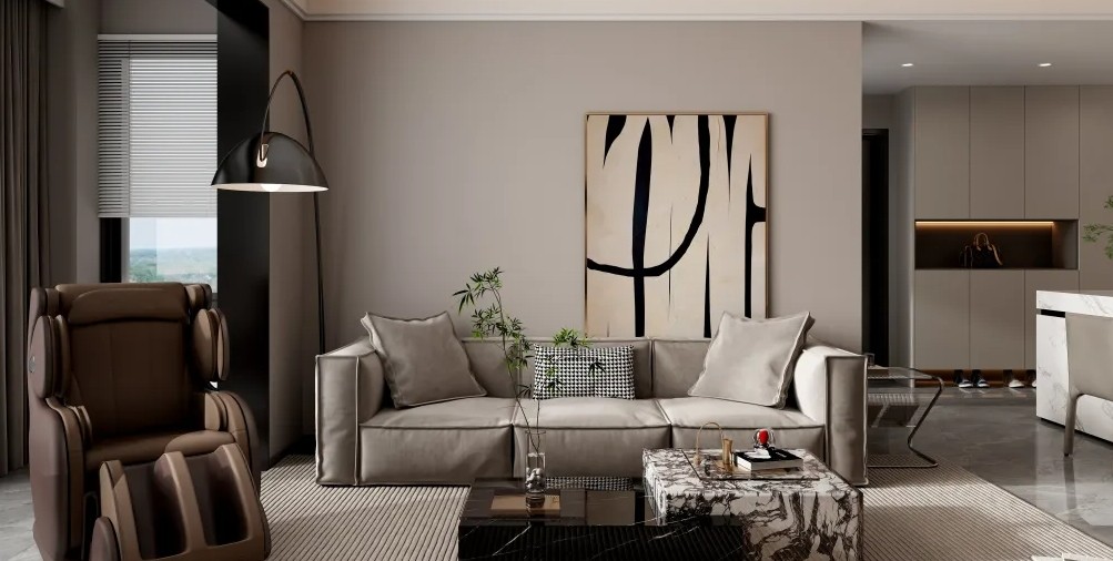 客厅设计以凝聚为主题,曲面收拢主墙和天花板,柔化了淡灰底色的冷冽感。