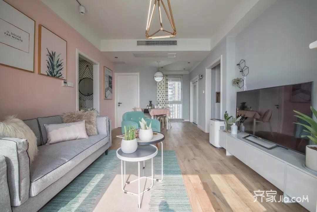 客厅与阳台之间用弧形门洞做区域分隔,落地窗透进来的光使客厅通透明亮,胡桃木地板沉稳含蓄,人字铺贴法空间更有延伸感。
