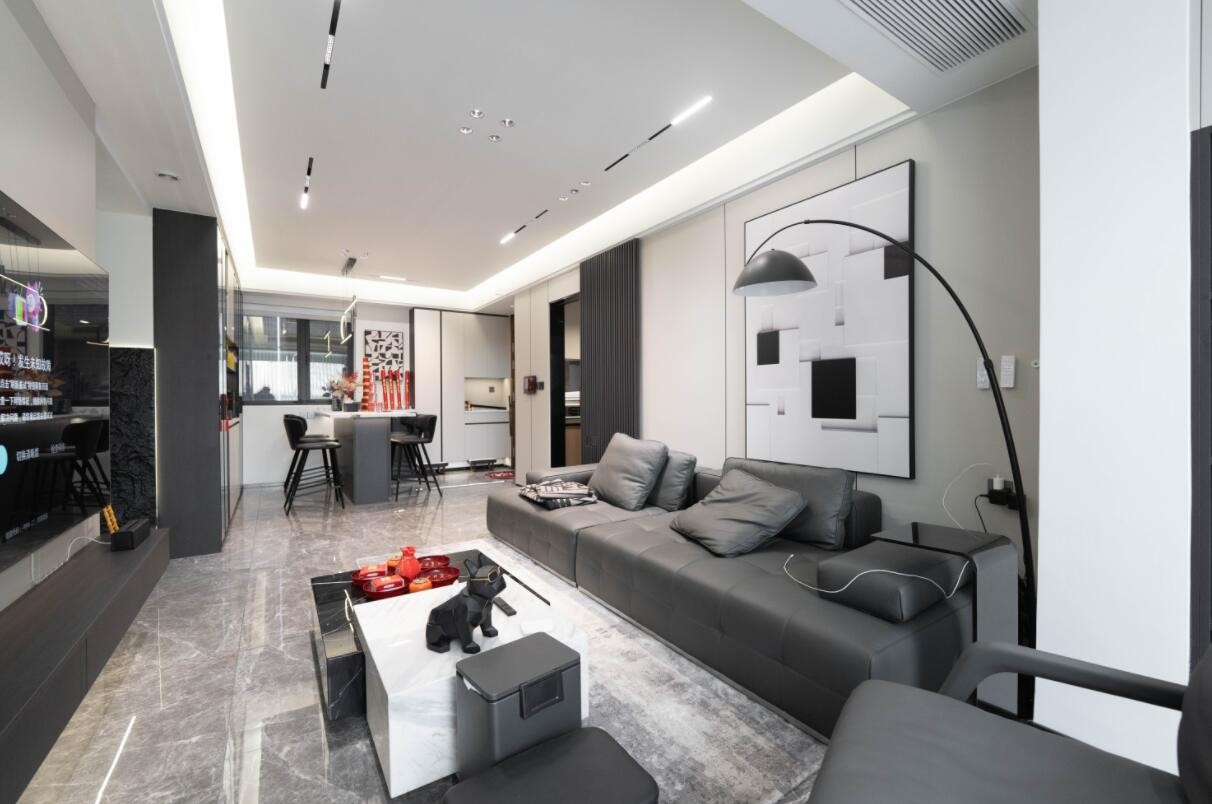 厨房作为客餐厅的分割线,长虹玻璃推拉门的门框采用了黑色边框设计,与整个房间的色调保持了一致性。这种设计手法不仅使空间看起来更加和谐统一,还增强了整体设计的质感与档次。