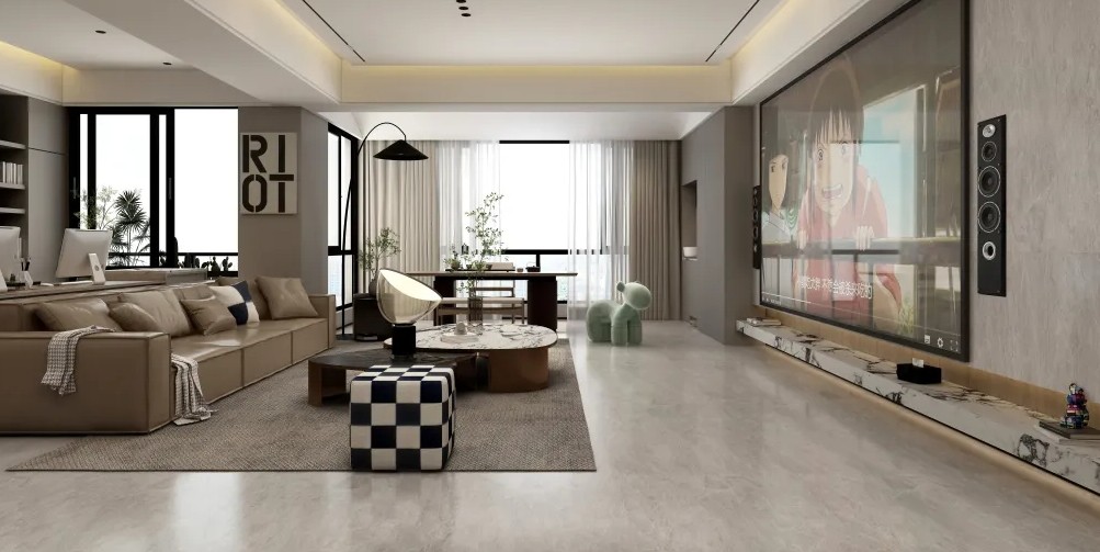 客厅,纳入阳台做横厅式布局,无主灯吊顶放大空间视觉感,整面大落地窗带来充足的自然采光,勾勒出现代且自由的生活空间。