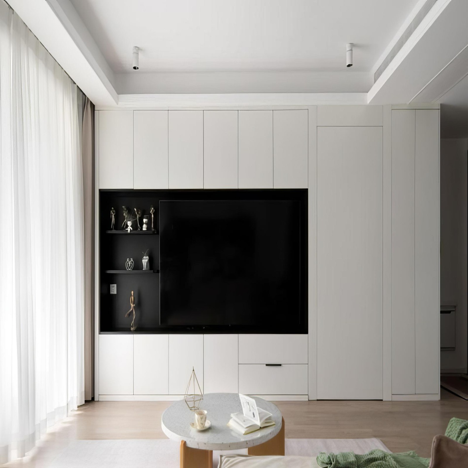 次卧的隐形门与电视柜相结合,拉长电视背景墙的视觉长度,弱化房门对整体性的破坏。同时电视机部分采用黑色框套的形式,强化突出电视机部分的视觉效果,黑色框套的长向比例也更加协调。 开放格上放上业主喜欢的空气凤梨,搭配可爱有趣的花架,这就是生活的一隅呀。