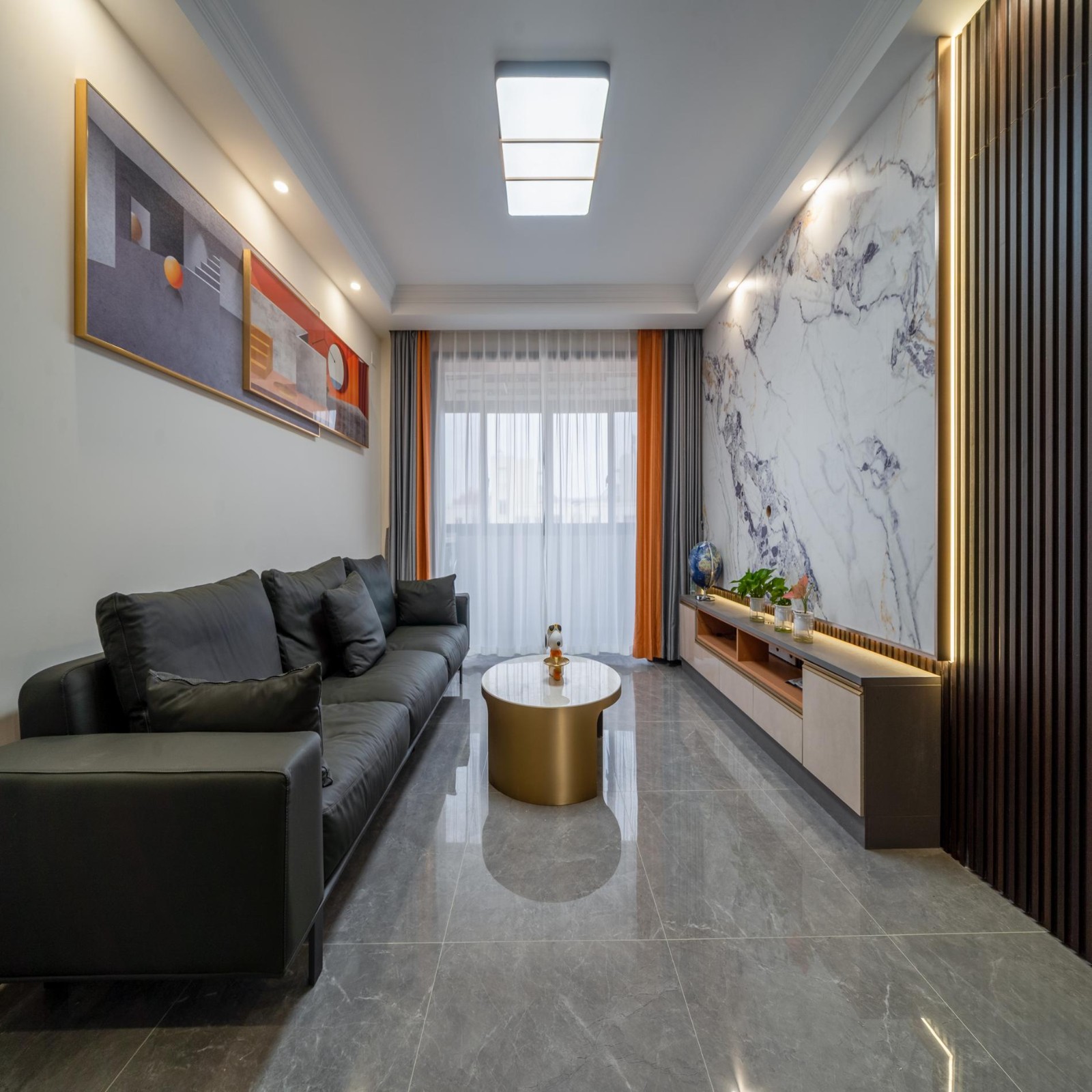 主色调灰+白的客厅空间,加入一些橙色和金属色进行点缀,突出现代简约的轻奢调。