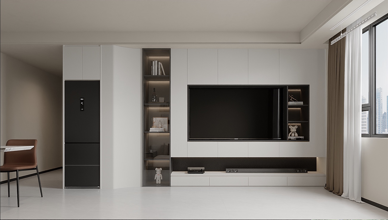 客厅电视背景墙做了大量的储物柜与冰箱柜子融为一体,这样又能储物还美观