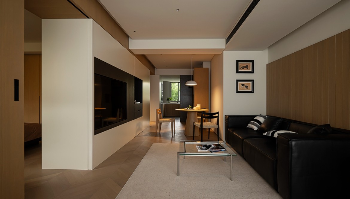 客厅视角横梁保持横平竖直,与洄游动线的柜体形成呼应