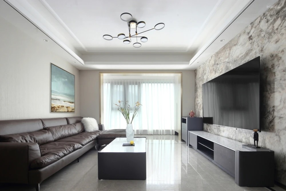 客厅空间简洁明丽,设计师将原户型自带的电视墙更换为拥有自然流动纹理的岩板,以动态韵律勾勒独特质感,与整体空间相协调。艺术挂画为空间增添清新亮色的同时,亦平添几分艺韵。