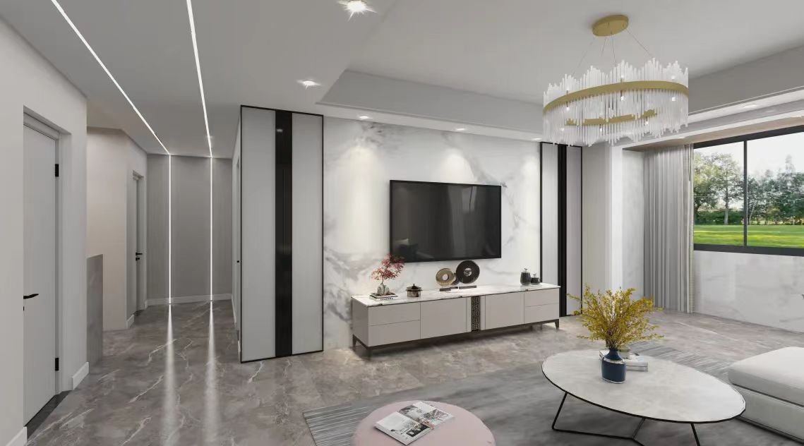 客厅整个空间采用人字拼的铺装方式,给人温润且优雅的视觉效果,线条的力量让简单的空间更富节奏感。无主灯的设计,空间更加简洁没有厚重感,视觉效果也更加开阔。