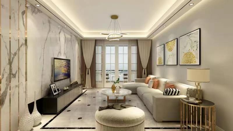 现代简约三居室设计,整体色调为米色调,墙面为米黄色乳胶漆饰面,地面为灰色大理石瓷砖,顶面为回字形石膏板灯槽吊顶结合黑色不锈钢线条设计,软装多以柔软的布艺和精致的皮革做装饰,搭配精美的装饰摆件和挂件,营造一个温馨、舒适的现代简约居家生活情调。