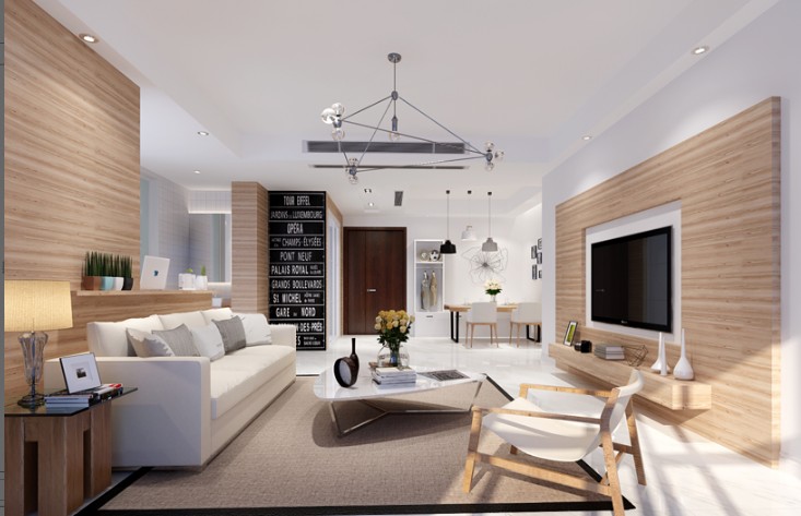120 平现代简约风格的客厅,宽敞明亮。白色沙发与灰色地毯简约搭配,时尚吊灯增添艺术感。
