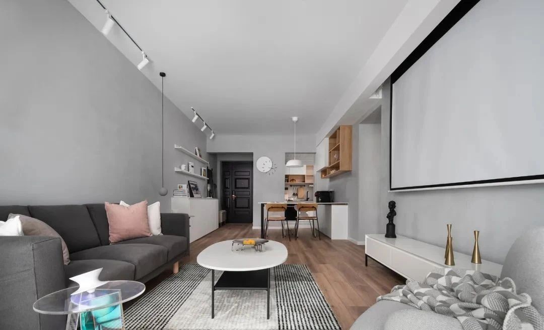 客厅,墙面涂刷灰***术漆,地面通铺木地板,加上无主灯设计,更显简洁大气。放弃了传统的电视,改用投影仪+幕布,在家也能有影院级享受。