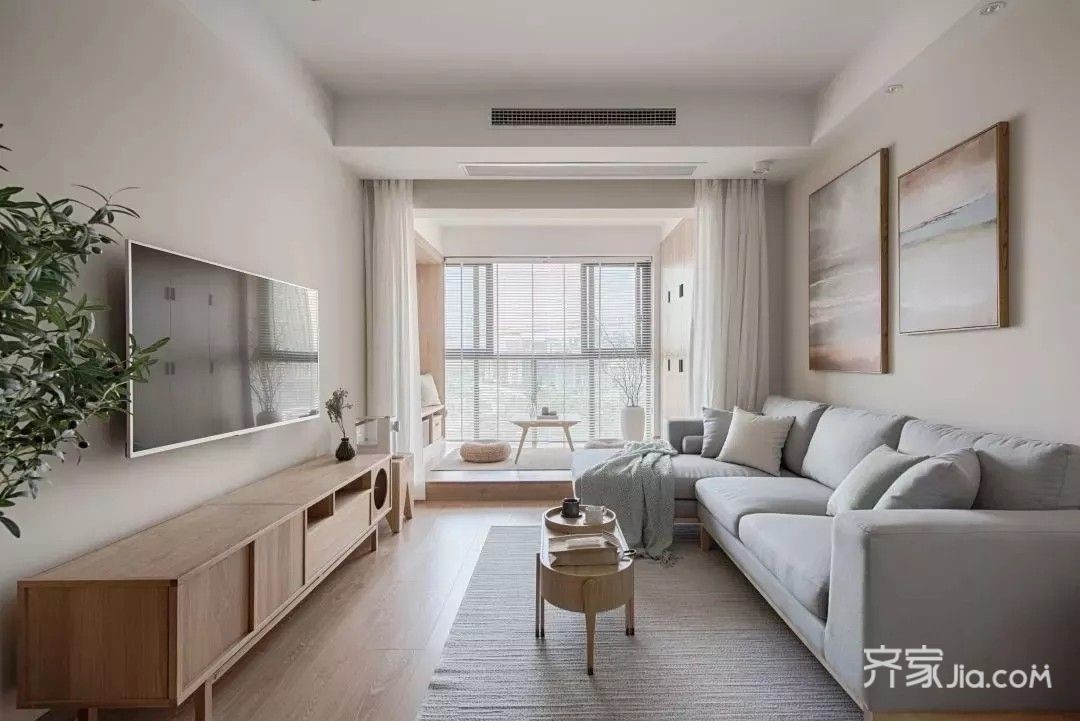 客厅的整体风格是简约的日式风,以白色和原木色为主色调,给人一种自然舒适的氛围感。