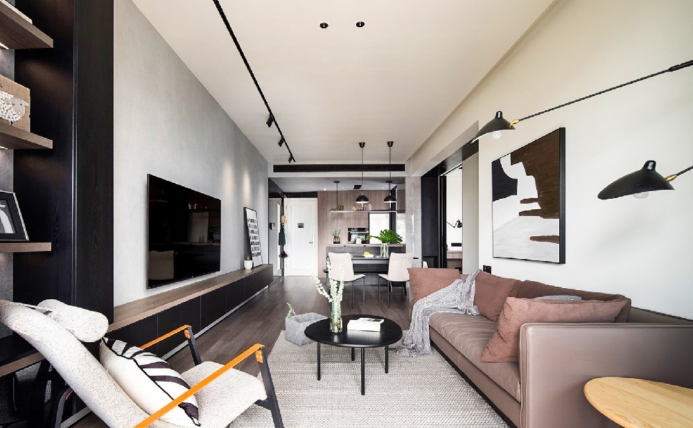 客厅在一个空间可以感受几个空间的存在,空间没有进行过多的界定,这正是空间的魅力。材质的运用上,客、餐厅墙面清水泥做空间延伸,深浅的肌理,增加空间层次的过渡,烘托着黑色、深棕木色富有肌理感的电视柜。