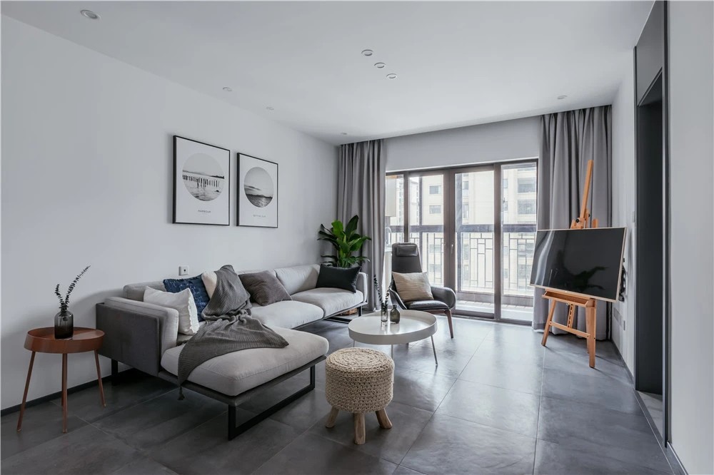 由于客厅和卧室的公共墙面较窄,不能做常规的电视背景墙,也不能摆放沙发。设计师就创造性的将电视用支架放在了墙面和窗子的三角区域,既不会感染出入卧室,也能在客厅的另一侧摆放沙发。