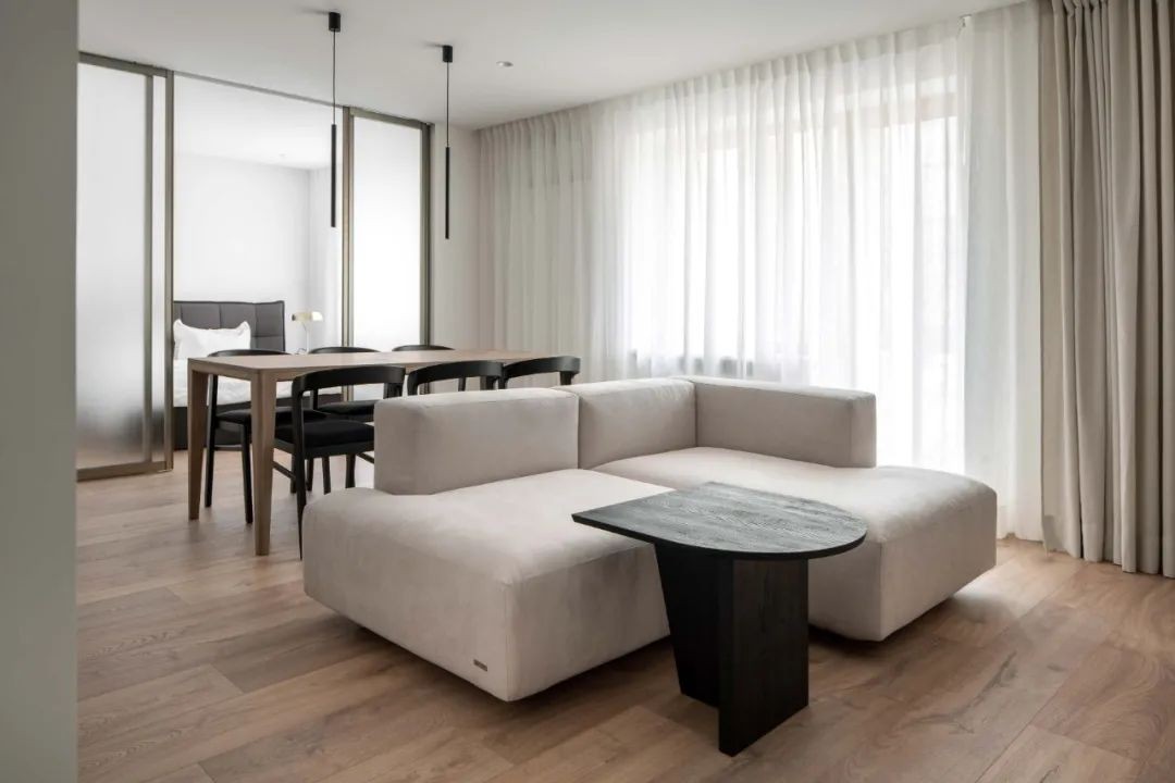 设计师以现代简约的设计风格,灰白色和木色为基础,微水泥的地面相辅相成,营造温暖舒适的生活空间。