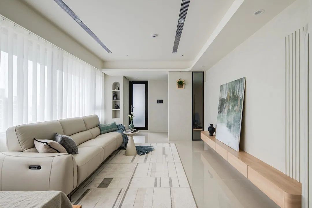 客厅灯光设计以聚光崁灯、轨道灯、间接照明铝条灯、软条灯,以匀柔光影,浮显独特氛围沙发依傍窗框幻亮浅底蕴主墙,勾勒为光之路径