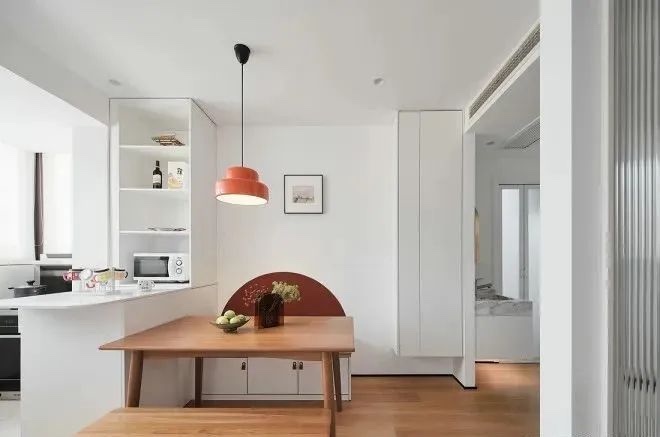 客餐厅,打造了卡座代替了沙发功能,满足了多人就餐的需求,同时还增加了收纳功能。一侧打造了到顶的悬空收纳柜,既提供了收纳空间,还避免大面积柜体带来的压抑感