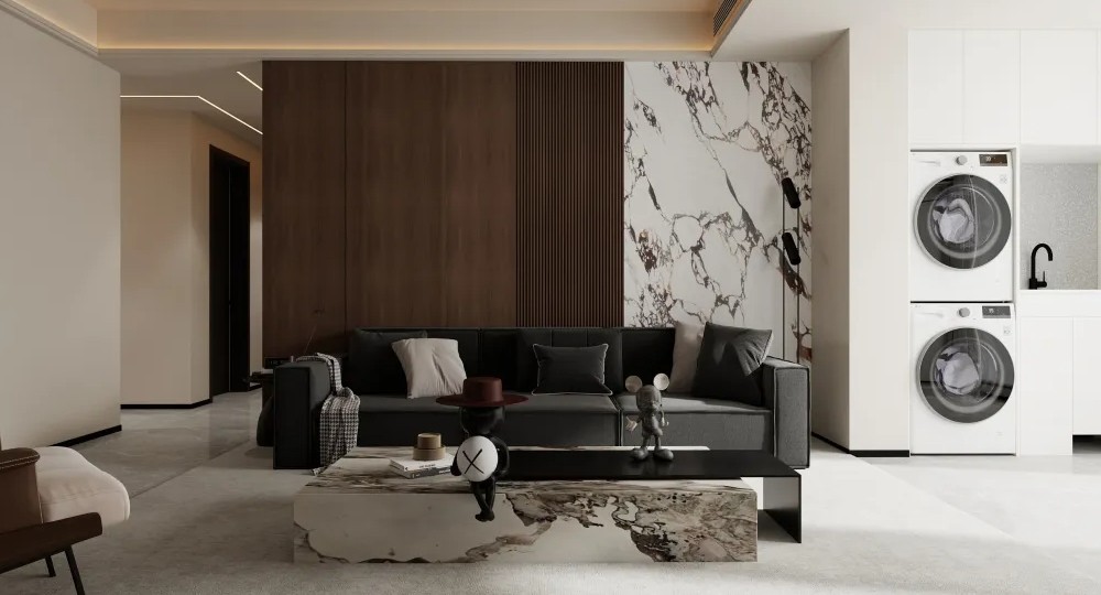 客厅采用浅色大理石地砖,搭配黑色皮质沙发和木纹背景墙,使空间更加明亮。