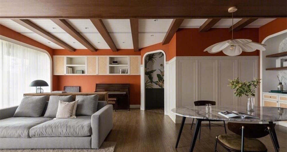 以木作斜天花修饰突兀大梁,并将管线包覆起来,让整体视觉更简洁,而柔和的杏色电视墙,则为鲜明的橘色空间,型塑出优雅恬淡氛围,至于两侧的圆拱壁龛,在嵌入线灯后,兼具展示与置物功能。