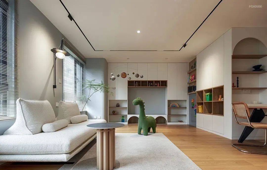 主卧选择了相比传统创高度更低的地台床。因为宝宝还小,有时候会和父母一起睡,地台床高度更低,宝宝翻滚也不怕摔到。
