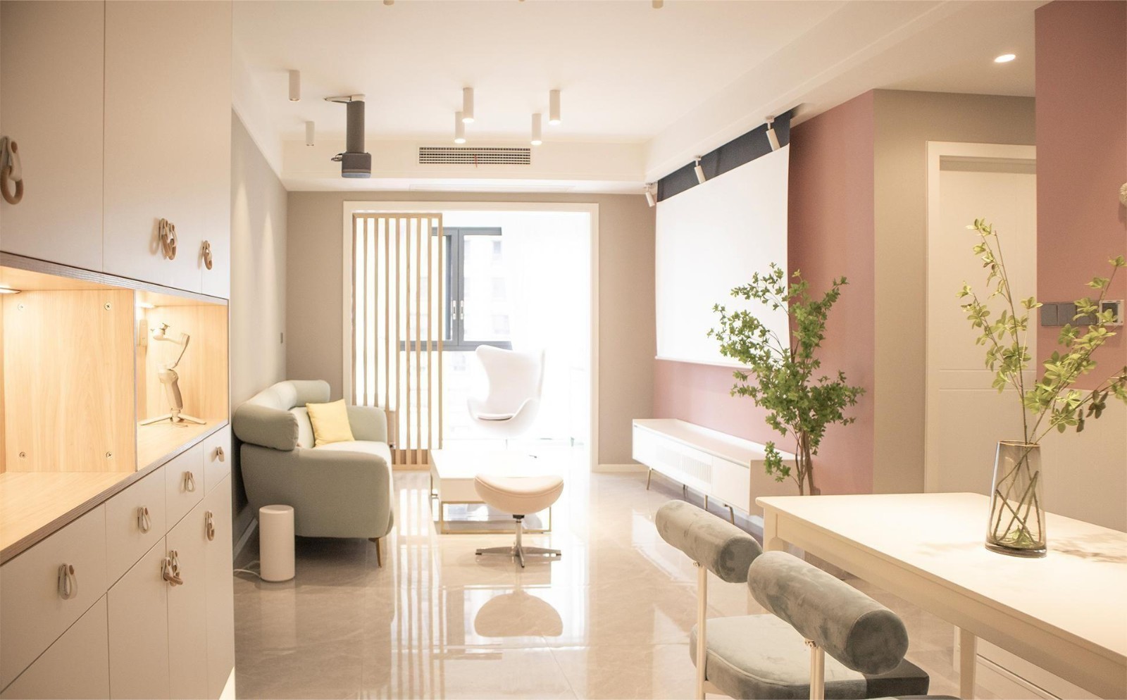 客厅和餐厅联通,空间比较大,客厅打造多彩时尚空间氛围,客厅的背景墙用了灰色乳胶漆,电视背景墙用了粉色乳胶漆,和家里低饱和绿色的沙发进行对比。