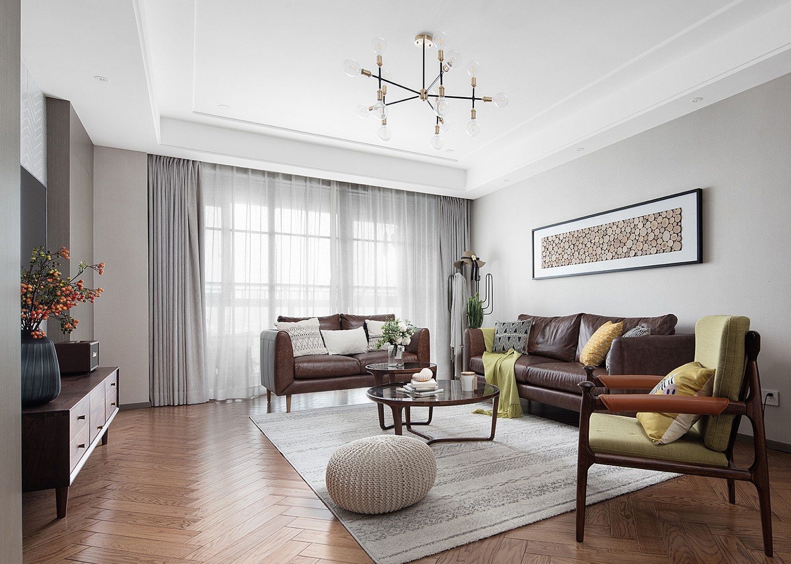 整体墙面是以复古灰色的背景墙,搭配深色的皮艺沙发,一张圆形的托盘茶几,让客厅显得简雅而又时尚大方。