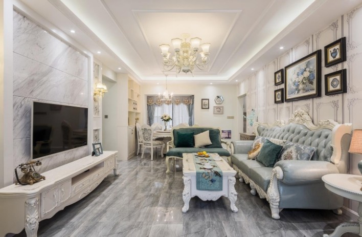 沙发背景采用简约的欧式线框墙纸,一副精美的挂画,让空间灵动起来,皮质的沙发质感超好,柔软舒适让身体尽情放松