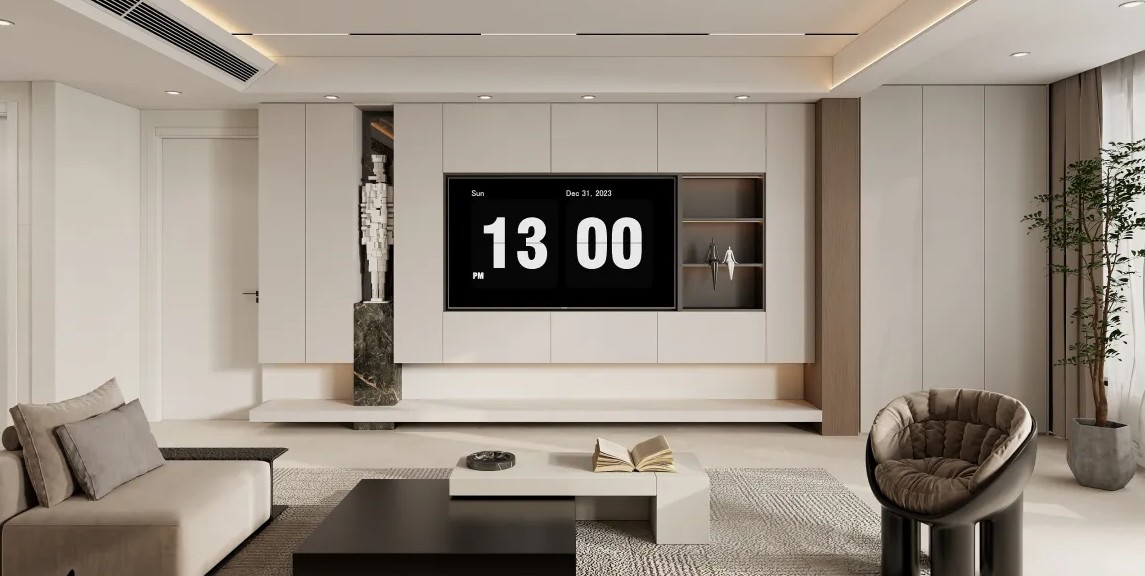 几何图案瓷砖抢眼,智能设备提升便利性。
