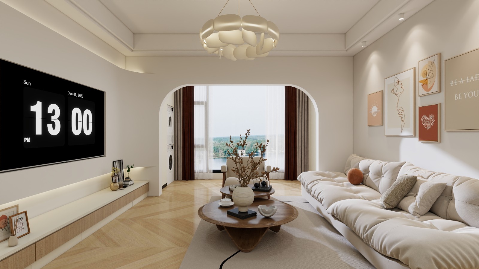 整个客厅空间以奶白色和原木色为主,墙面以极简为主,甜而不腻,为空间增添了平静安稳的氛围。