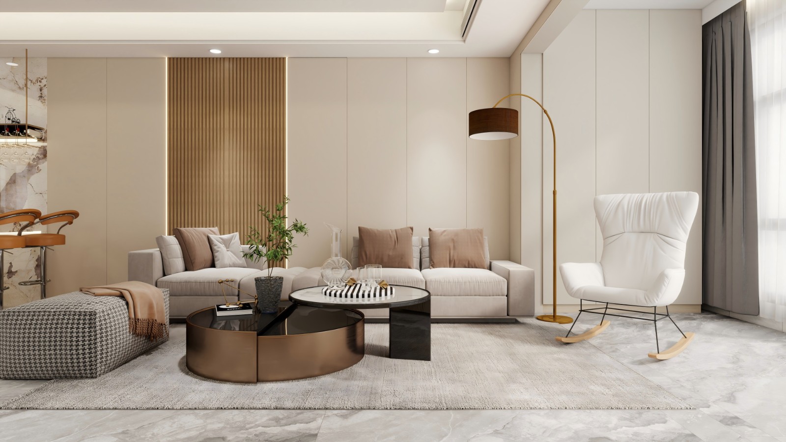 客厅面积较大,能够放置大型的组合沙发、茶几和电视。客厅还带有一个景观阳台,可以欣赏室外的风景,阳台上可以放置休闲桌椅,作为一个休闲区域。