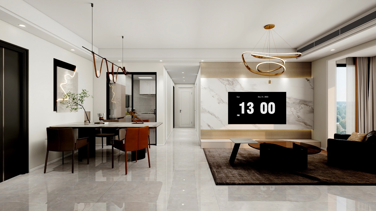 客厅、餐厅区域效果图。