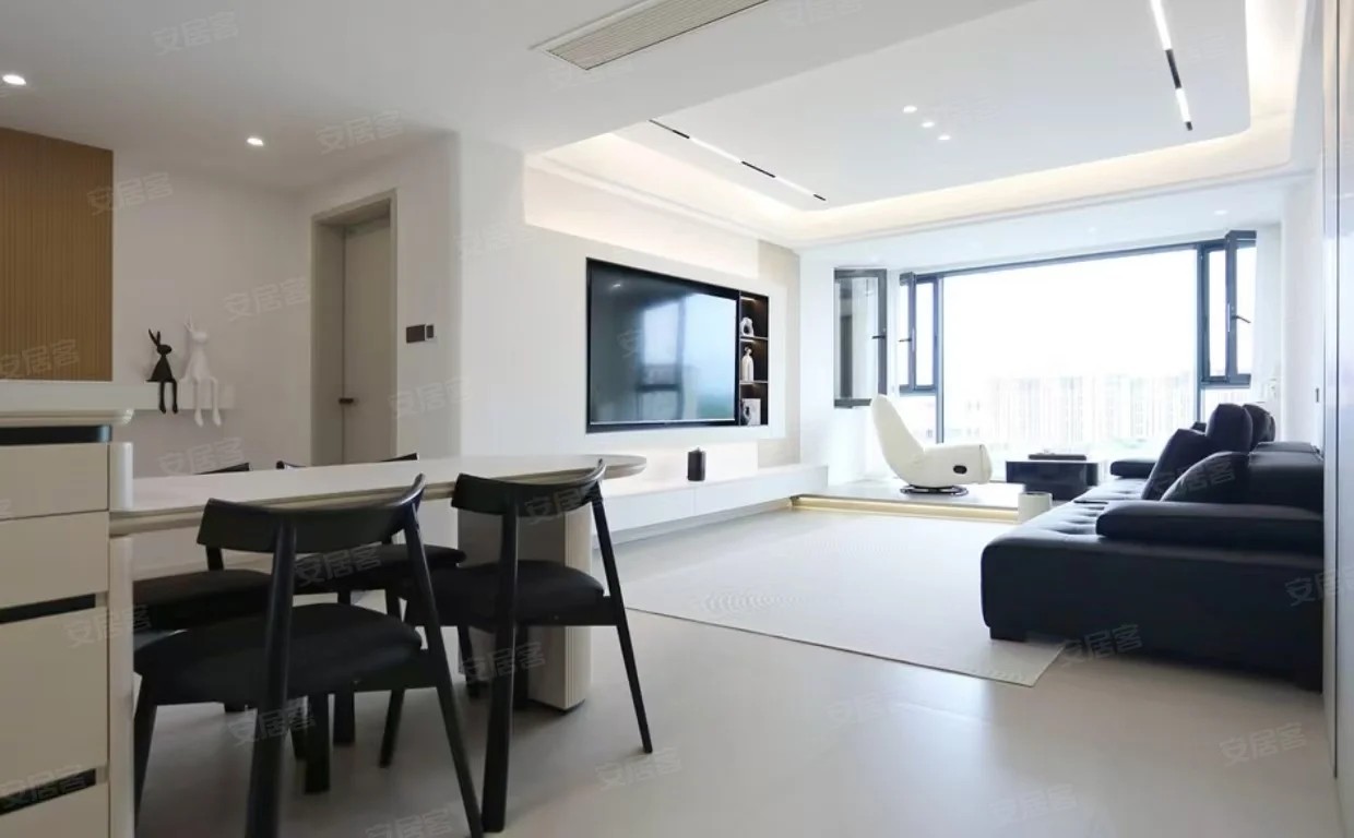 此为现代简约风格的户型。客厅宽敞明亮,电视墙简洁,搭配黑色沙发与白色旋转椅,时尚感十足。餐厅紧邻厨房,方便就餐。大面积落地窗保证充足采光,窗外视野开阔。整体布局合理,色调以黑白灰为主,营造出简洁大气的氛围