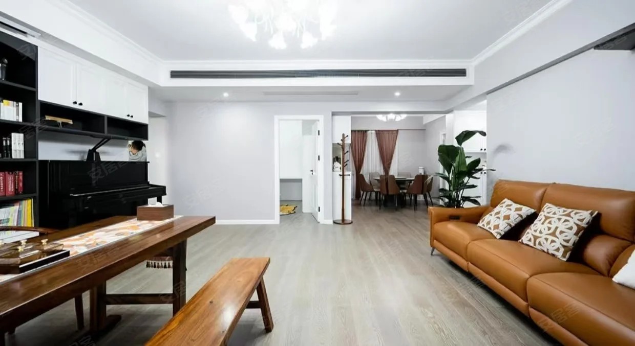 现代简约风格的客厅。浅灰色墙面搭配白色天花板,营造出简洁明亮的氛围。棕色皮质沙发搭配几何图案抱枕,时尚且舒适。室内绿植增添了自然气息,落地灯提供了温馨的照明,整体设计给人一种温馨且高雅的感觉