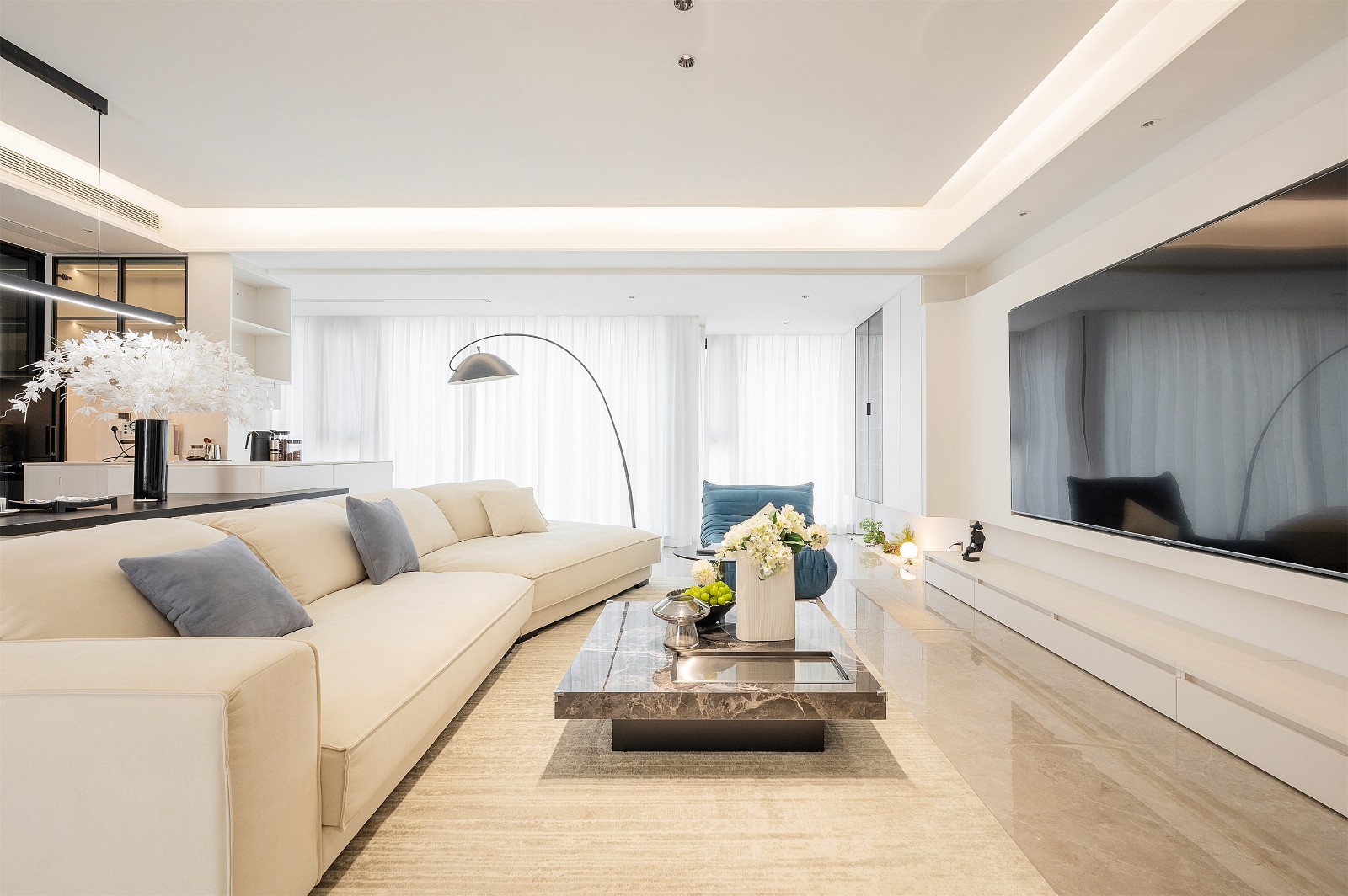 硬装与软装相辅相成,同时在柔和的一片浅色中加入雾霾蓝,增加清雅的质感。