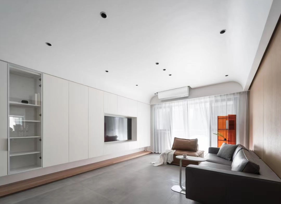 白天微风和光线透过窗纱穿梭进客厅里,室内随之变得柔和,开阔的空间配合自然光演绎宁静惬意的格调。 即使在夜晚,无主灯防眩筒灯的照明设计促使画面保持其原有的温润。电视收纳墙柜没有刻板地顶天立地,天花作弧形延伸,柔化棱角,过渡自然。
