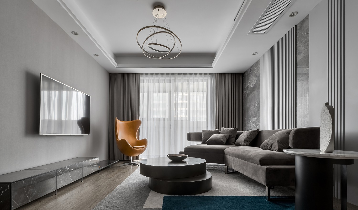 在不变动格局的前提下,通过改变原硬装饰面的色彩与材质,丰富空间情感,去除顶面繁琐的线条,让整个空间干净利索,使得原本平淡的空间充满质感。硬装与软装完美融合,梦幻灰大理石、灰色烤漆墙板、绒面沙发、金属茶几、黄色蛋壳椅,不同材质、饱和度的灰与一抹亮色交替演奏一场层次丰富的交响乐。 作品内的家具都是由我们设计定制的,款式可选性更多,自由更改配色及面料,让整体更加协调呼应。